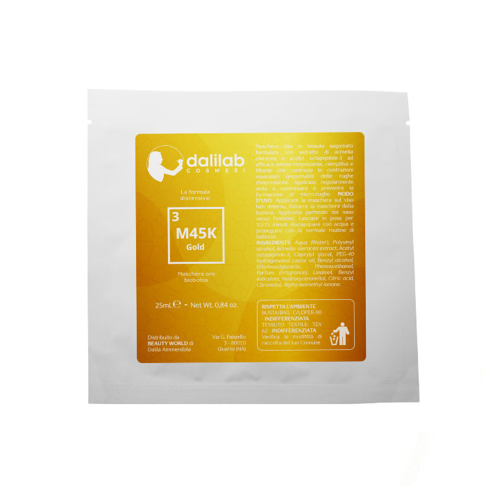 M45K è una maschera viso in tessuto sagomato formulata con estratto di acmella oleracea e acetyl octapeptide-3 ad efficace azione rimpolpante, riempitiva e liftante che contrasta le contrazioni muscolari responsabili delle rughe d’espressione.